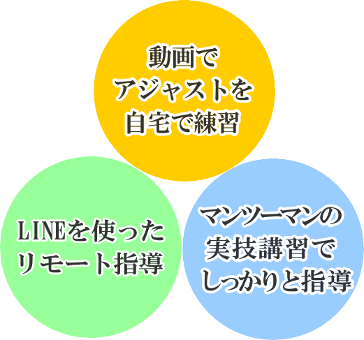 忙しい方、今の仕事を続けながらアジャストの技術を習得したい方に適した「動画講習+リモート動画指導+完全個別の実技指導」を組み合わせた整体師養成講座です。